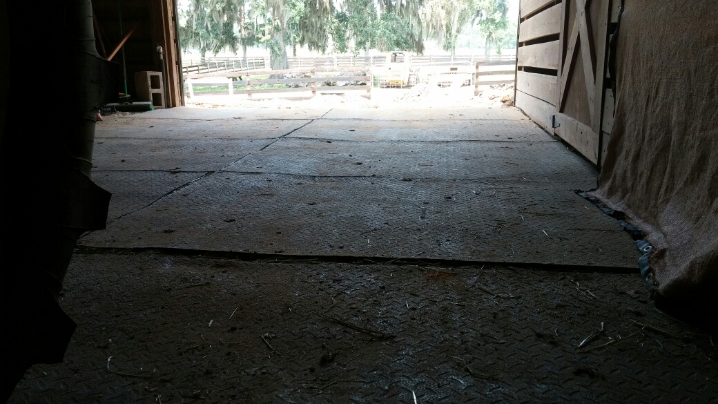 The cement work is happening first. This week, in addition to the new footings, they will lay down cement in the center aisle and around the outside perimeter of the old section. The floor of the original barn is packed ag lime only and the center aisle, though protected by rubber stall mats is uneven and lumpy. It will be dug out and leveled for the cement pour, so one of our tasks this weekend was pulling up all of those stall mats which weigh about 100 pounds each. That was a lot of fun.