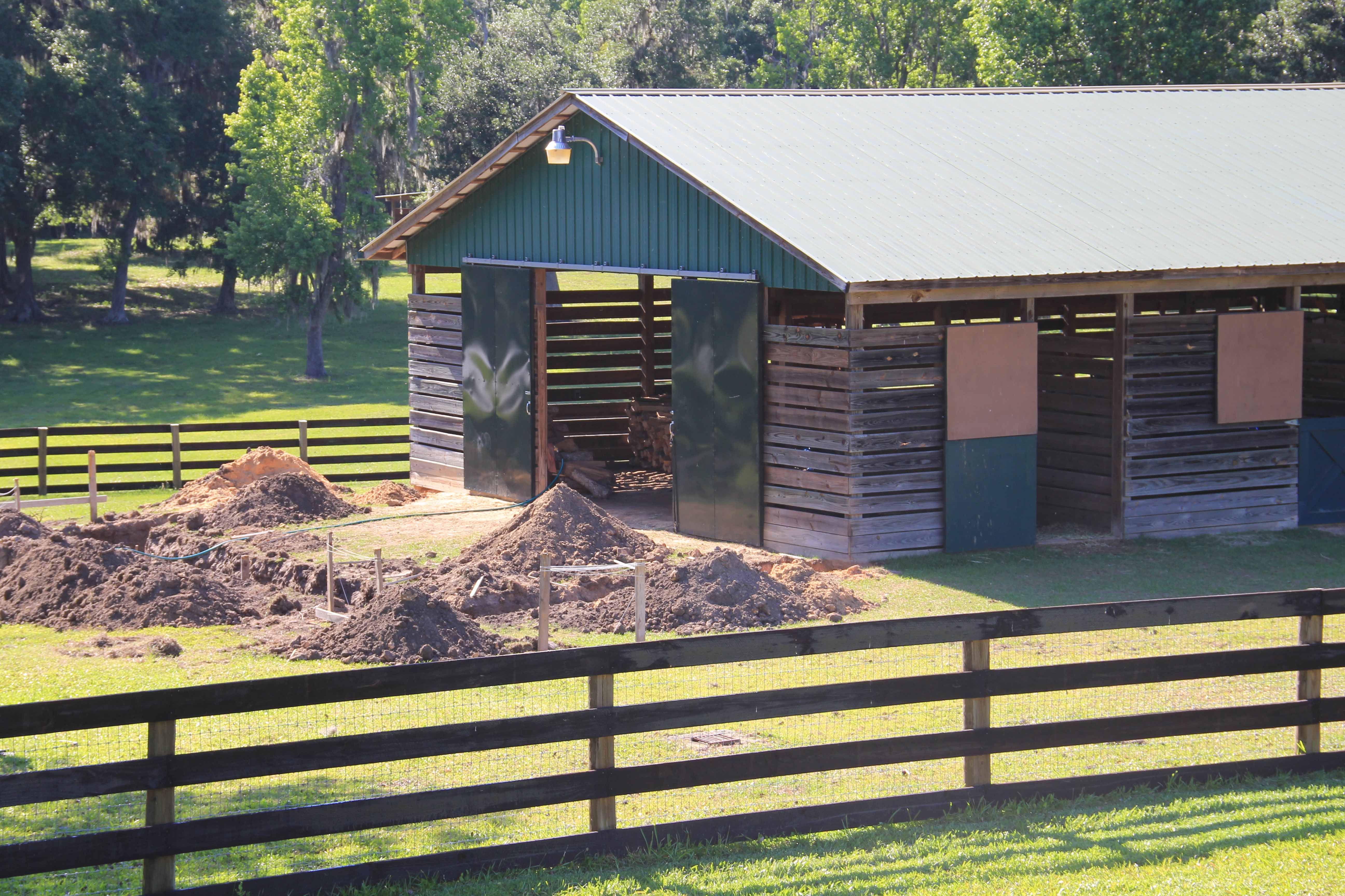 We will keep the ag lime footing in the stalls for the horses, but the lack of foundation around the old section has allowed a fair amount of erosion. Adding a cement “paw pad” around the perimeter will serve as a bumper to retain the footing and also prevent the horse from pawing through.