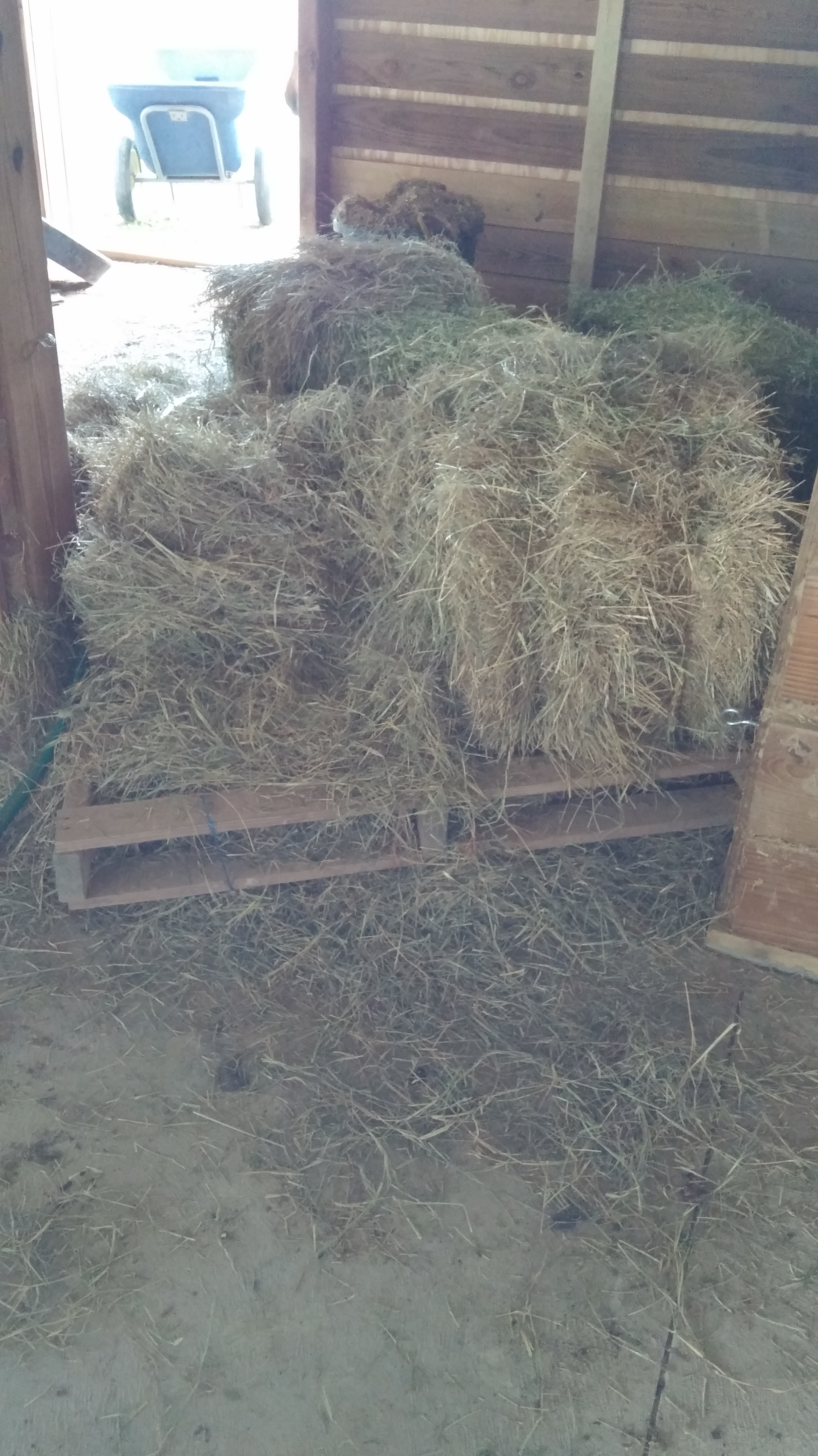 Filou has left his stall (no, he never does) and has wiggled his way into the blockaded stall which holds the hay and feed. He was trying to reach the alfalfa and, in doing so, stepped through the slats of the pallet holding the hay. His front foot is stuck and he is panicked. I am a lunatic for the second time today.