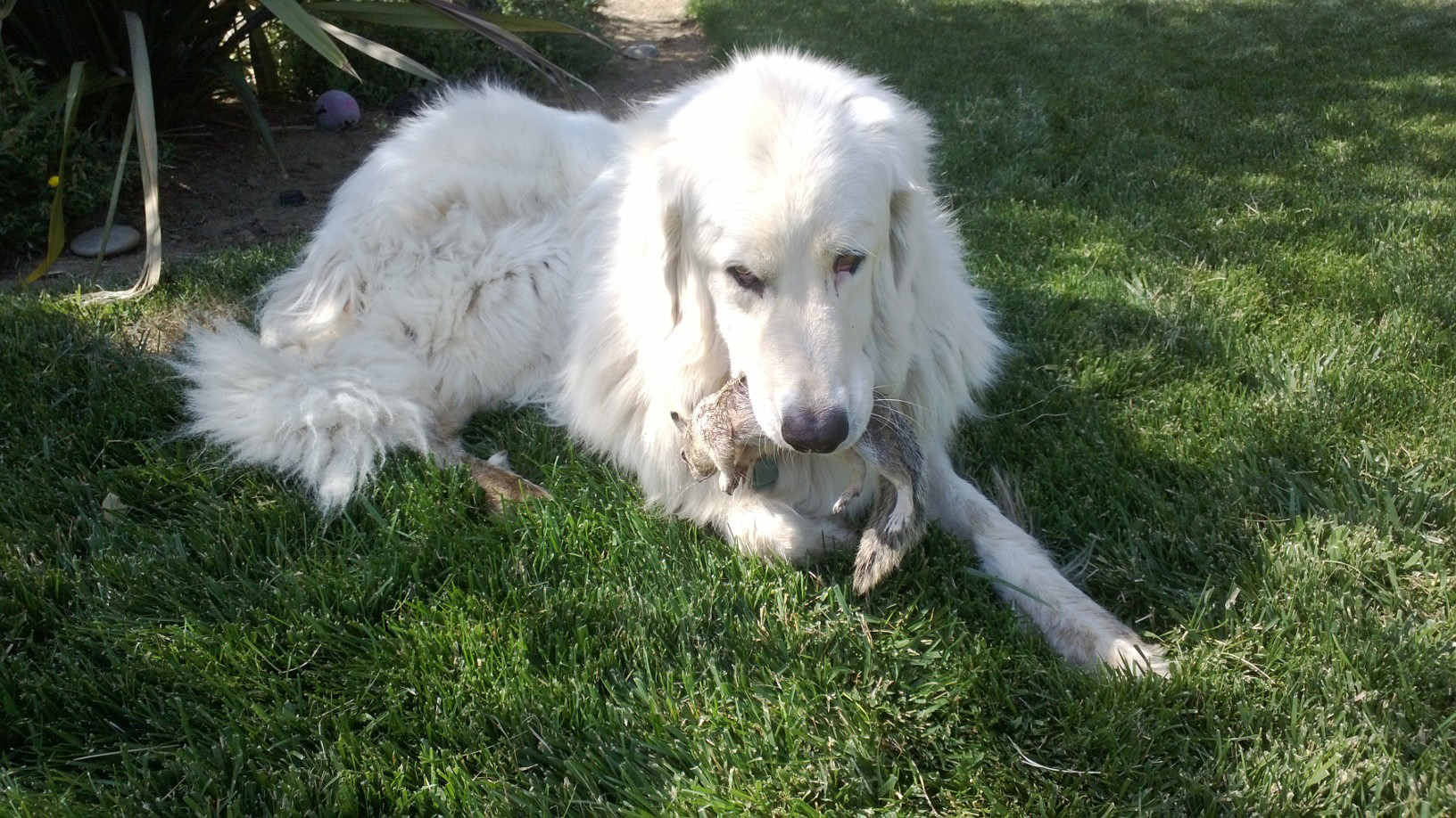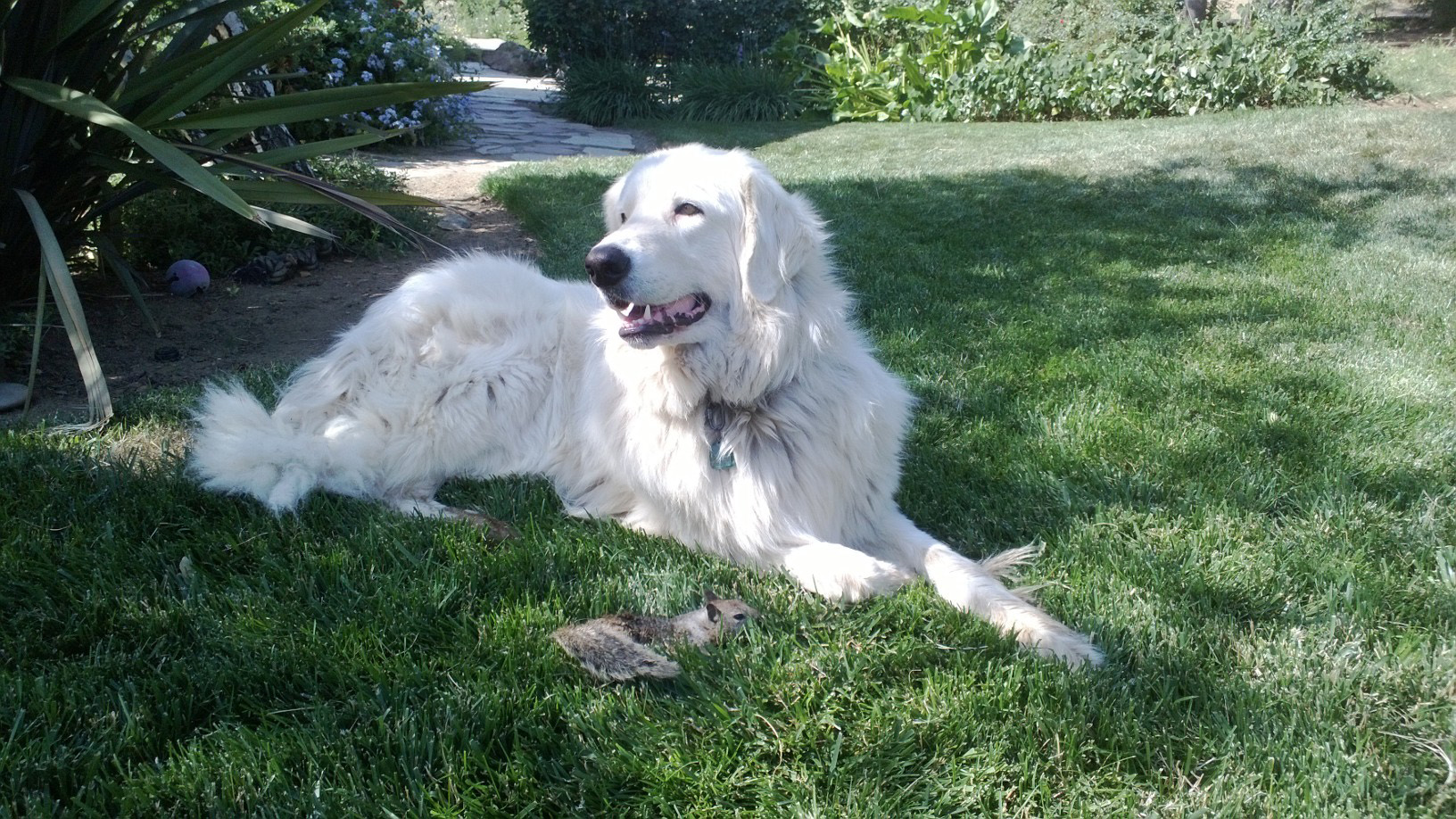 Gracie, the terrier, is a killing machine. Mice, chipmunks and squirrels are her particular passion. Now, a squirrel can out-maneuver Grace in the open, but if it is cornered, Gracie has the upper hand because she is fierce and has no regard for her own safety (or yours, if you are in the vicinity). In one such incident, Gracie got her chops on the cornered squirrel, but it managed to break loose and in a flash it was in Marco’s mouth who loped off with it. I gave chase to the back yard where Marco now lay with the squirrel still in his mouth.
