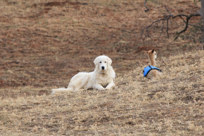 It’s one thing to believe you can shape the behavior of a dog, it’s another realm entirely when you witness their independent decision-making and realize how nearly impossible it would have been to “train” that. In their first months with us, Sophie and Marco spent most of their time with the mama alpacas and the young ‘uns who were particularly vulnerable to predators. The newest addition to the herd was just days old when a break in the rain gave us a chance to let the herd out onto the hill for some much needed pasture time. The mamas and their babies stick close together in the pen and I assumed it would be no different in the bigger space. We watched the herd until all seemed settled and went on about our chores. Looking up some time later, the herd was not in sight … they had gone over the hill to seek better grazing near the creek. Everyone, except the new baby. And Marco.