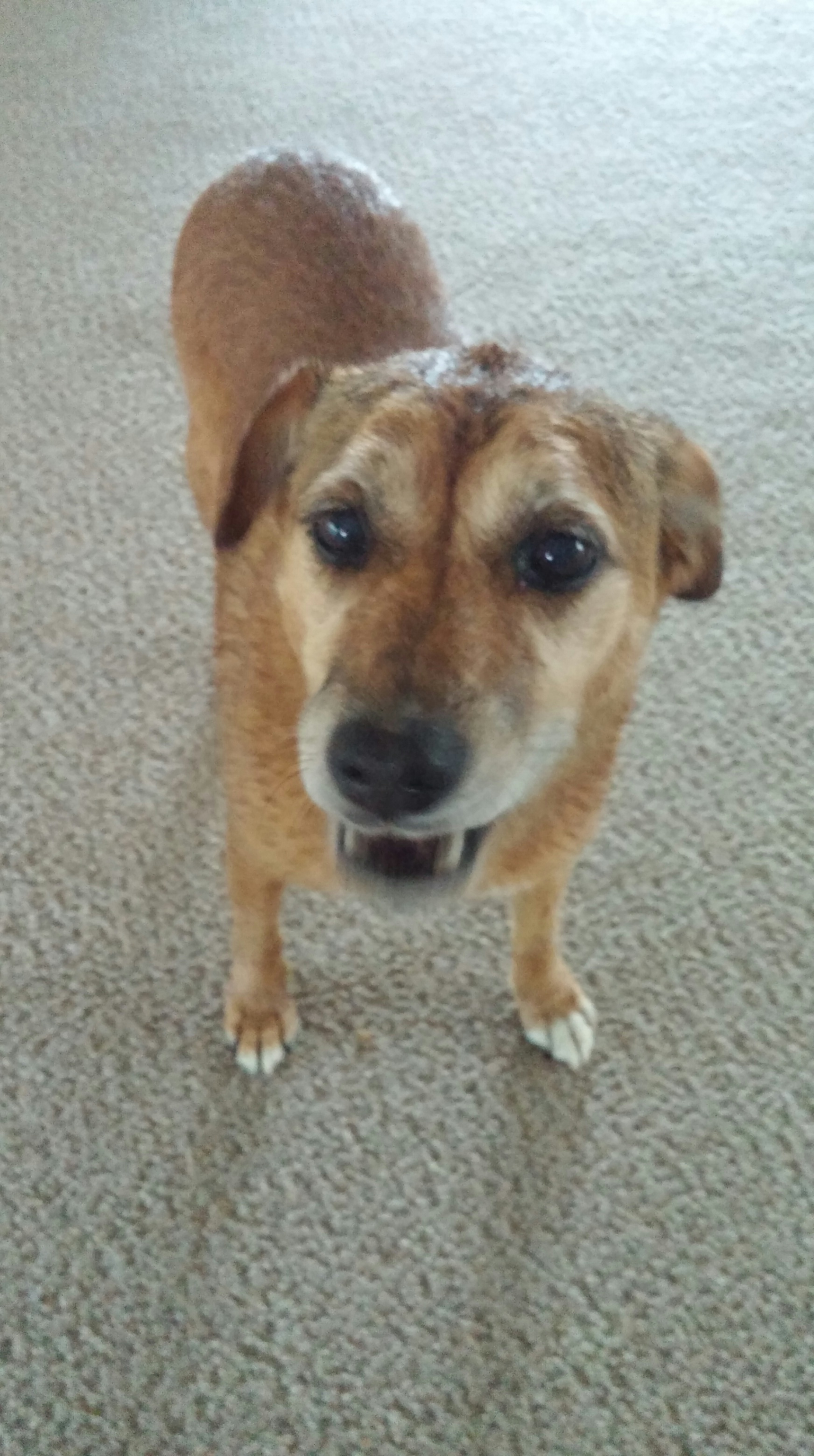 She had no collar to lead her by and I am not one to be overly familiar with a strange dog, but she made it pretty clear that picking her up was appropriate in these circumstances. And so I did, carrying her into the house through our doggy gauntlet, large and small, and barricaded her into the bathroom.