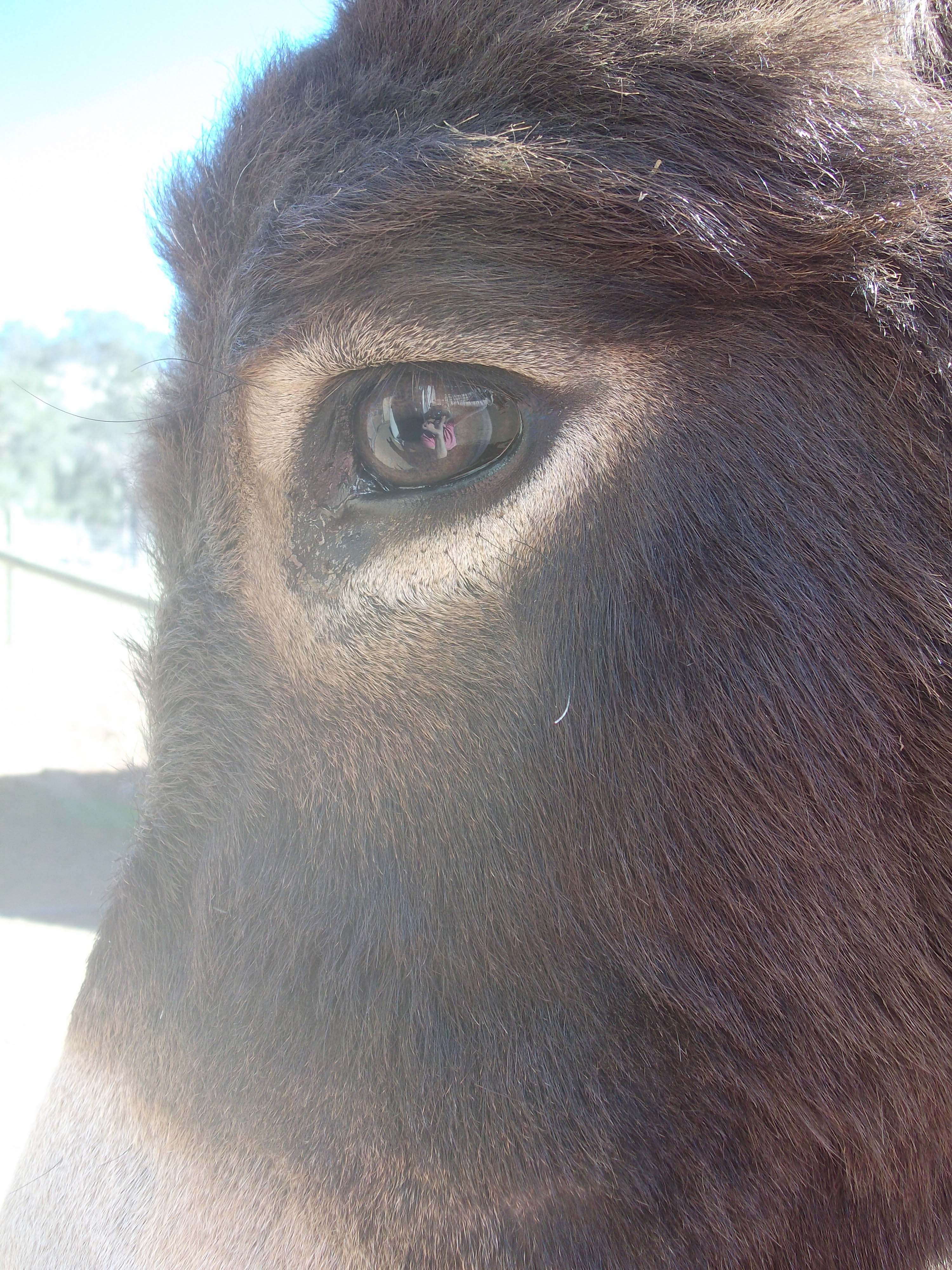 Eye contact is important to a donkey; the presence or diverting of it. You can drive a skittish donkey away, standing still, holding too much eye contact. You can drown your sorrows in the deep, brown liquid pool of a donkey’s eye holding contact. I have.