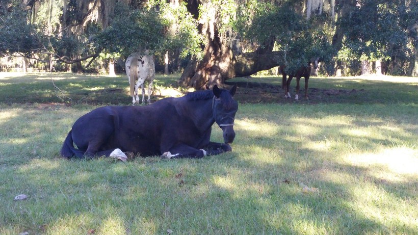We finished our walk, the dogs and I, and the horses did what calm and peaceful horses do: They took a nap, together, under the Mother Tree.