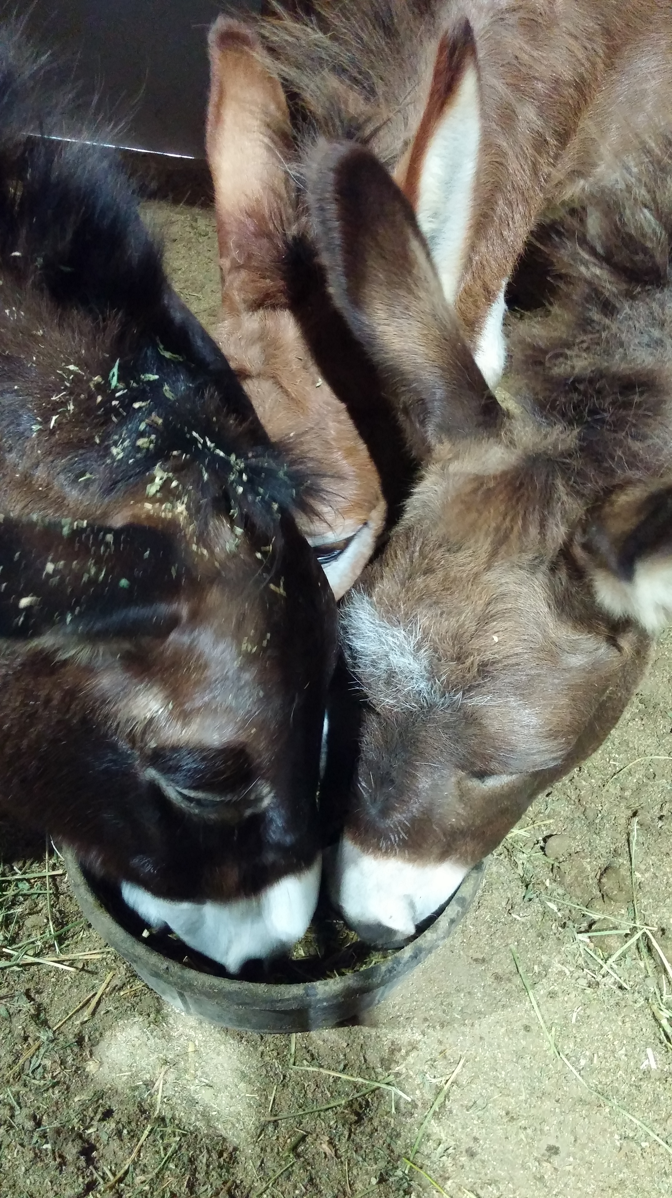 I treat the donkeys extra, extra special, crouching low in their space, rotating the food dish so that all are treated fairly.