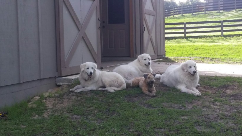 Wheatens – Gracie and Molly on the couch, Monroe  (who thinks she’s a maremma) on the floor, then the maremmas – Sophie in the back, Giada, and Marco.
