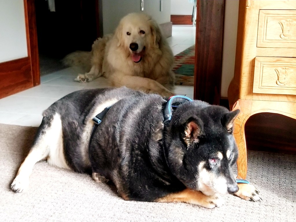It was a hard thing to see. When Toots laid down, her hind legs splayed out beneath her. To get up, she had to heave her front end upright and slowly “walk” her weight back over her hind feet until they could give her the leverage to rise. She was too heavy to carry. Suddenly, the distance between the back door and the grassy yard seemed like a quarter mile. It took her FOREVER to walk there, with plenty of rest stops in between. We worried about her heart and her legs — how could they withstand such a prolonged burden?