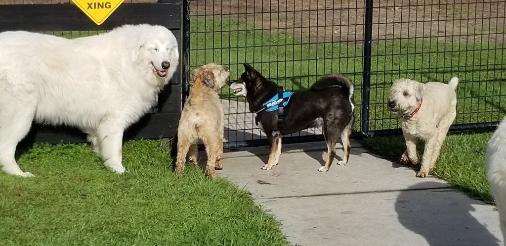 Still, with all of that, Miss Tootsie was a sweet and willing soul. She accepted the wild proximity of the pack and seemed eager to explore her new environs. In pretty short order, we began to matter to her, too. We called out to her and clapped to let her know we were present. We got her a harness with a sturdy handle which we used to guide her through the house and outside. And we put her on a diet.