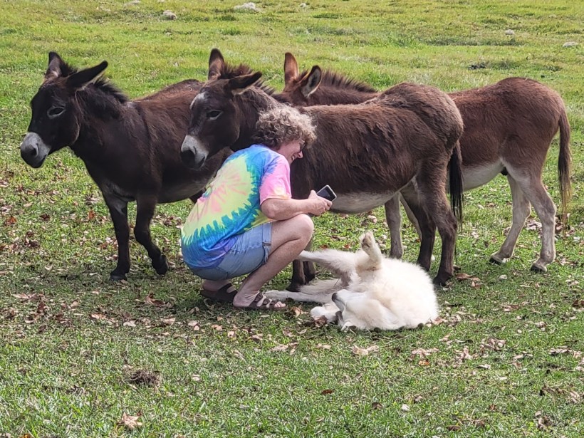 I think secretly this was the draw for coming back; to see if the magic was still there and yet, again, the donkeys did not disappoint. I love the horses and feel so strongly for and with them, but the donkeys are uncanny in their sense of connection. I take no credit. It is not learned. It is their “isness” to be that way. That picture tells you everything you would ever want to know about such things. No one called out to the donkeys or told them company was coming. They knew and remembered and came to their “old friend” to shower her with kindness and fondness stored up for a whole year. If you stay true to your own kindness, a donkey will know that and be your friend for life. Be that with a donkey and then take it with you. Be that for someone else; reflect their true nature and kindness back at them, like a donkey would. There. Mystery of life, solved.