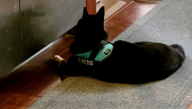 Tootsie has been with us two years now. A lot has changed for her in those two years. She lost her eyes and she lost 34 pounds, which was more than half her body weight. In the scheme of things, losing her eyes was the easy part. Glaucoma had taken her sight but left her in excruciating pain. Lose the eyes; lose the pain. The weight was a different matter. Food was everything to her, most likely because it had been a surrogate to sooth her in her undiagnosed pain. Plus, she wanted the good stuff — people food in all its forms. We fed her strict rations of weight loss dog food. Period. Her only treats were carrots and frozen broccoli and she was beside herself at these dismal offerings. But, bit by bit, she changed what she wanted. Today, she is no longer frustrated with us or her diet and quite looks forward to the bright spot that is her noon carrot, parking herself in front of the fridge, waiting for it to open and dispense that orange treasure.